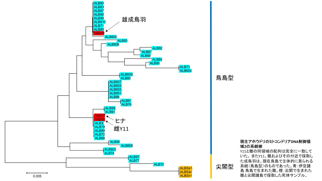 番いの雌(Y11リング)の血液サンプルは鳥島から聟島への移送時に保管されており、そのDNAと平成26年のヒナおよび雄成鳥羽のDNAを比較検討した。DNA分析は東京都小笠原支庁、小笠原自然文化研究所、北海道大学総合博物館、山階鳥類研究所の4者による共同研究で行った。