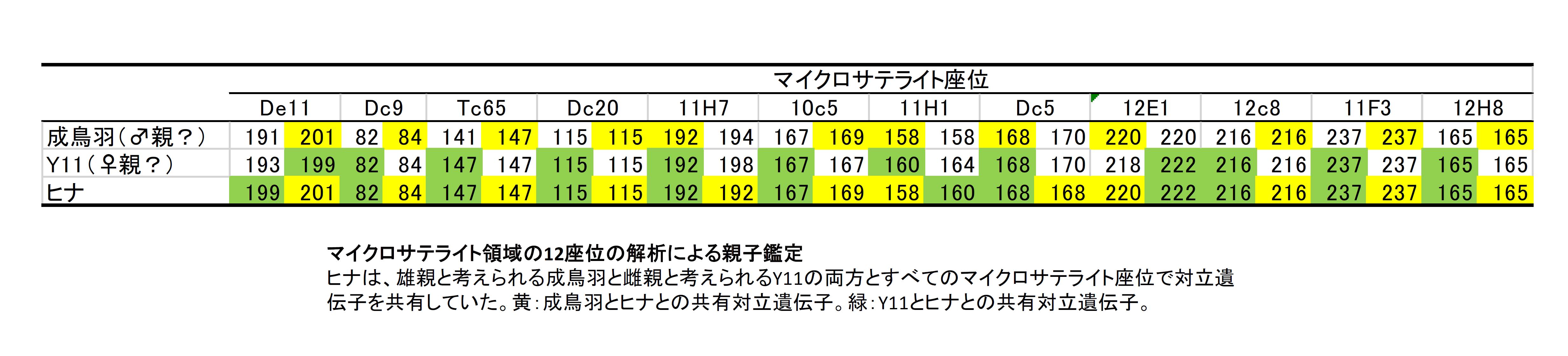 ⇒ヒナがY11と成鳥羽の雄個体の子であることに矛盾はない。(仮に一つの遺伝子座についてでも対立遺伝子の共有がなければ、親子関係は否定される)。