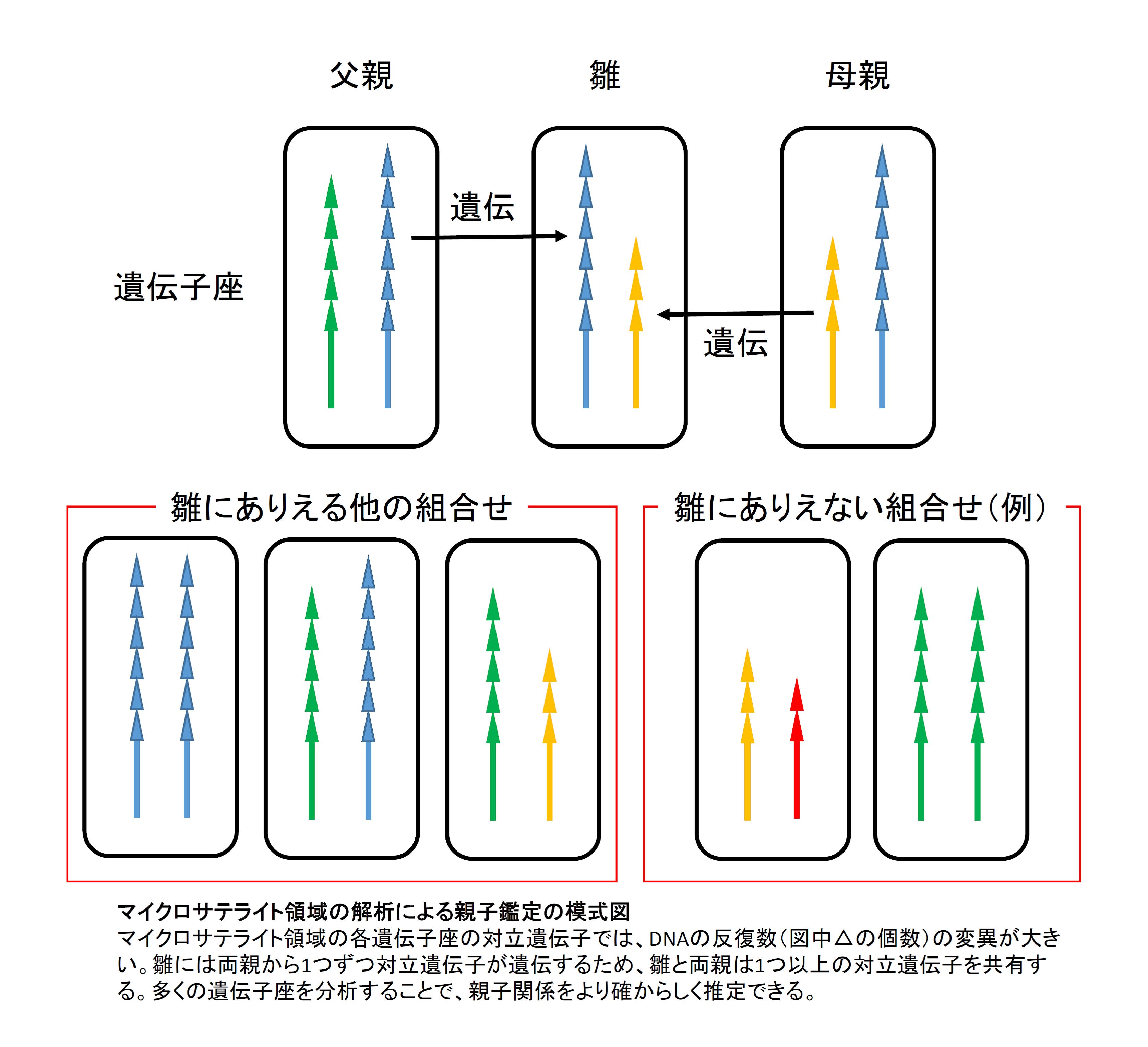 - ・マイクロサテライト領域は、核DNAにあるDNAの反復数の変異の多い領域で、人間の親子鑑定などにも利用される。各遺伝子座について、両親から1つずつ遺伝した2つの対立遺伝子を持つ。