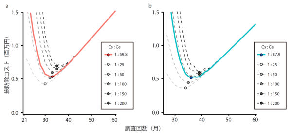 東海(a)および城南島(b)における防除対策を継続した場合の費用(総防除コスト)の総額を推定しました。Csは毎月のモニタリングコスト、Ceは誤って根絶前に防除活動を終了し防除前の密度まで再増殖したと仮定した場合の根絶コスト、Cs : Ceはそれらの比率を示しています。例えば、1 : 25ではモニタリングコストよりも再根絶コストの方が25倍高い場合を仮定しています。赤・青線は、今回の試験における実際のCs:Ce比に基づいて計算した場合を表します。 |