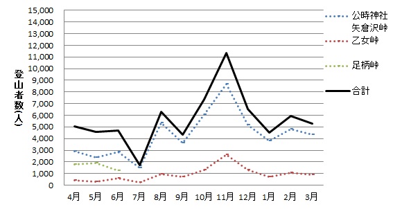 登山者は特に秋の紅葉シーズンに増加した一方で、例年突出しているゴールデンウイークのある5月は、大幅に登山者数が減少しました。