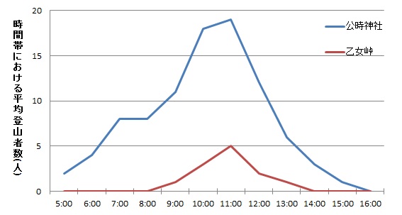 各時間帯の登山者数を平均した時間別登山者数は、公時神社・乙女峠コースで11時台に登山者数のピークが認められました。