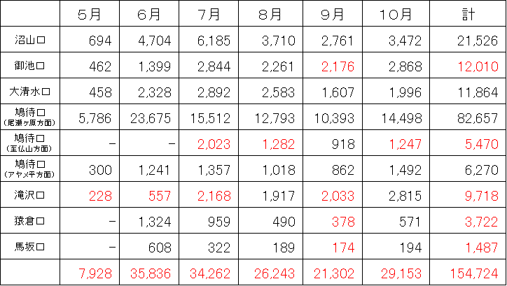 また、最も入山者数が多かった入山口は、鳩待口(尾瀬ヶ原方面)の82,657人で、次いで沼山口の21,526人でした。