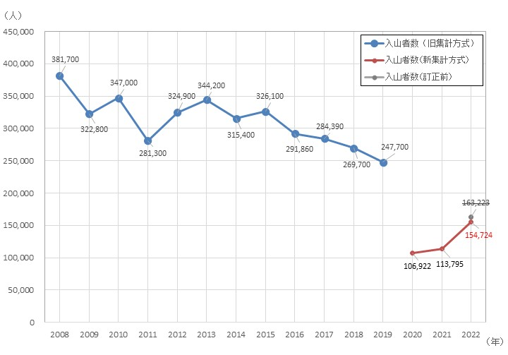 なお、赤外線カウンターの数値は霧などによる誤作動と考えられるデータを削除した上で集計しています※。また、赤外線カウンターの設置期間や設置数は、年によって異なっているため、過年度の入山者数と単純な比較ができない点についてご留意ください。