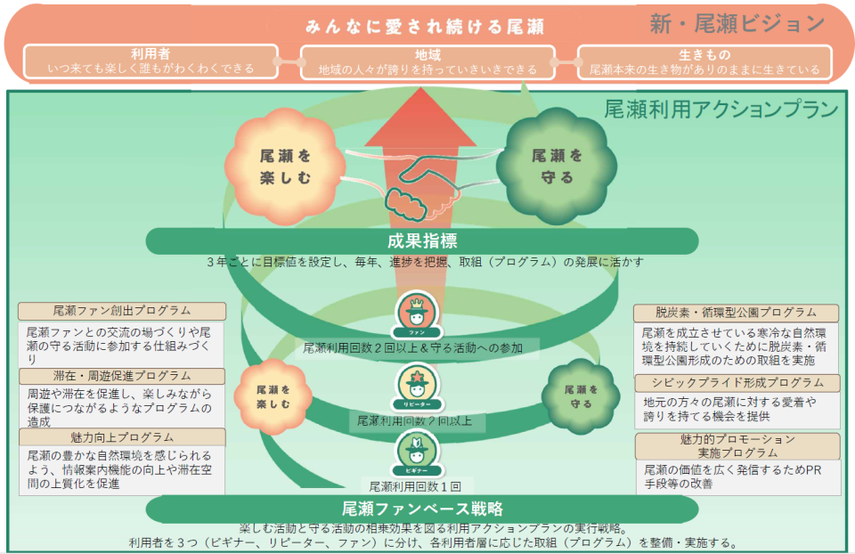 ・ 尾瀬の利用形態である楽しむ活動と守る活動の相乗効果を図るべく、利用者を3つ(ビギナー、リピーター、ファン)に分け、各利用者層の充実を図るための戦略「尾瀬ファンベース」を下記のとおり定めました。