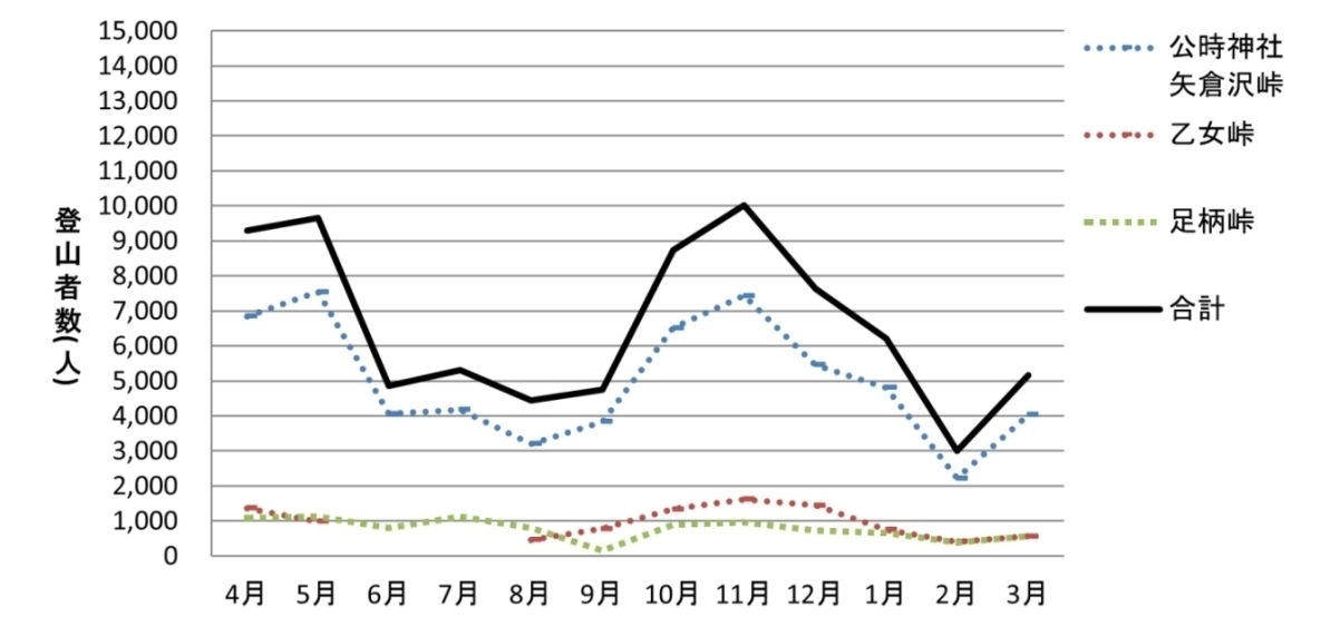 注2: 2020(令和2)年度~2022(令和4)年度のデータは、足柄峠コースで登山道の崩落が発生し通行止めであったため、足柄峠コースを計測の