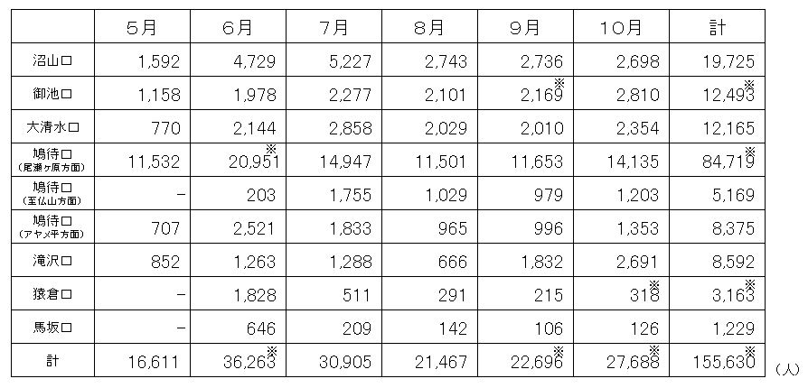 2024年5~10月の入山者数の合計は、約15万6千人でした。