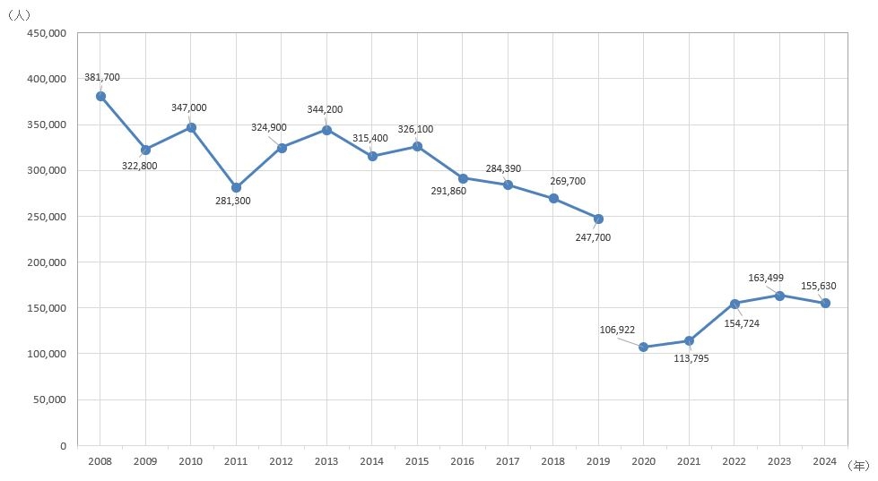 2024年における尾瀬国立公園の入山者数の合計は、155,630人でした(2023年比95%)。