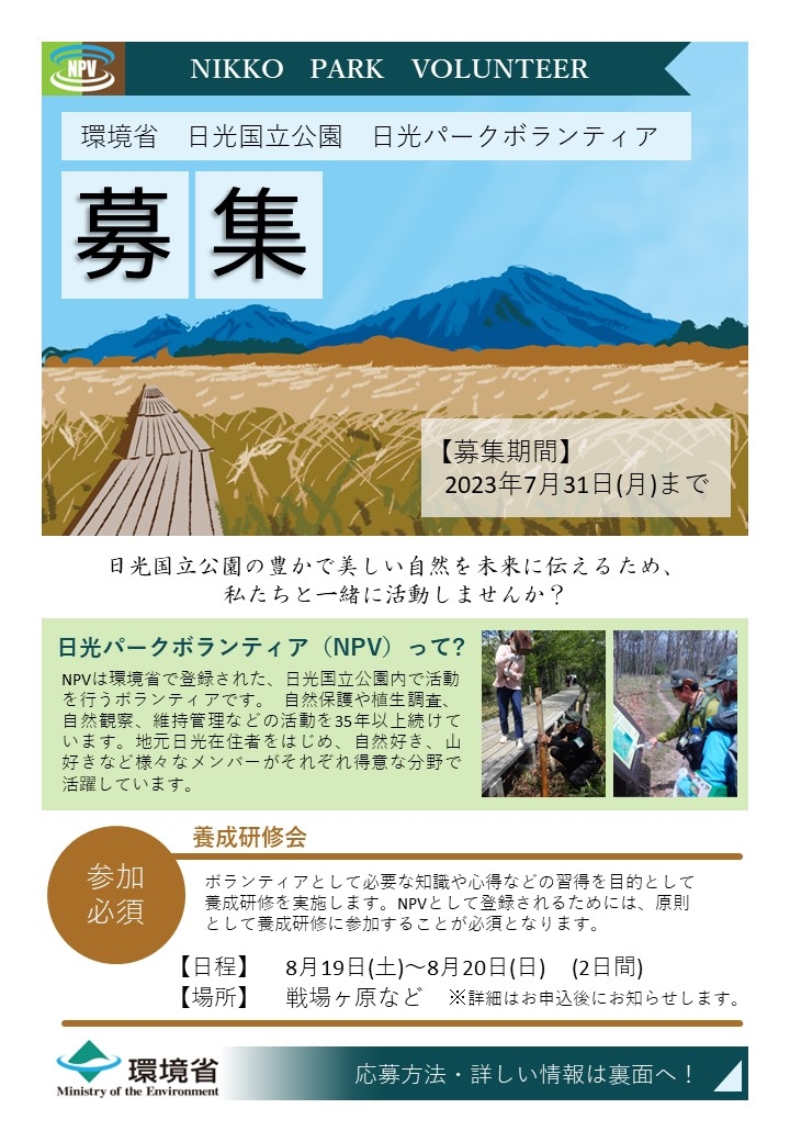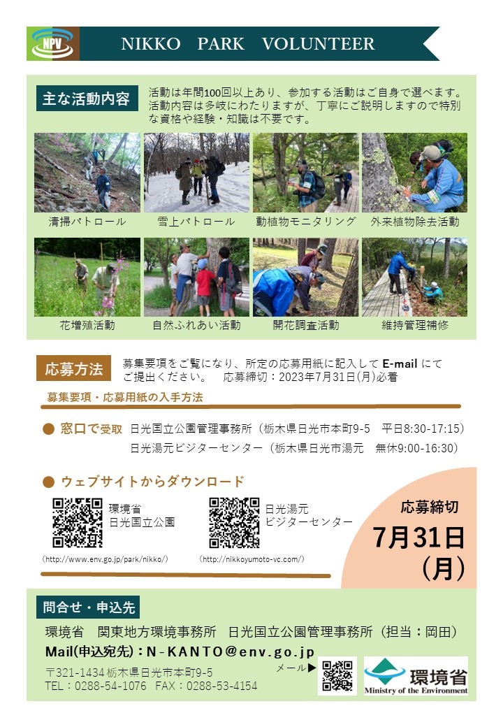 日光国立公園管理事務所では、日光国立公園日光地区において、美化清掃や動植物調査、自然解説等に協力していただけるパークボランティアを募集します。興味をお持ちの方は、添付資料の「募集要項」を確認の上、「日光パークボランティア応募用紙」にて7月31日(月)までにお申し込みください。