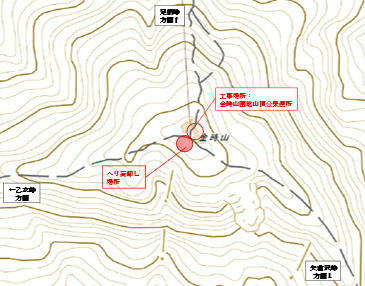 ヘリコプターによる資材運搬当日は、金時山山頂近辺の登山道に誘導員を配置し、荷揚げ・荷下し時には危険のない場所で歩行者に一時待機いただきます。