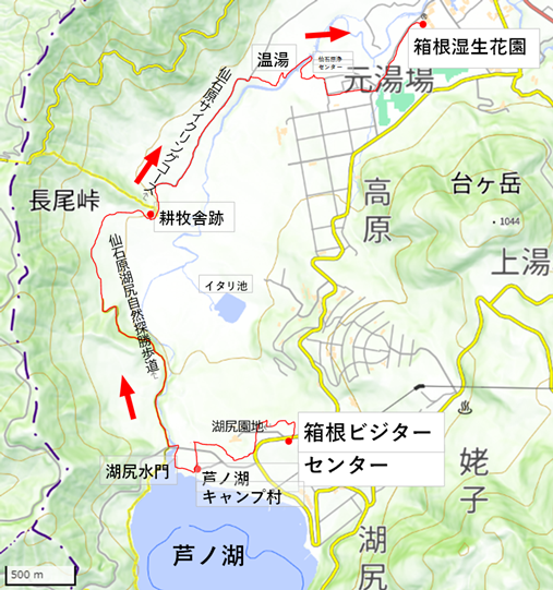 箱根ビジターセンター ~ 湖尻園地 ~ 芦ノ湖キャンプ村 ~ 湖尻水門 ~ 耕牧舎跡 ~ 温池(ぬくゆ) ~ 浄水場~箱根湿生花園